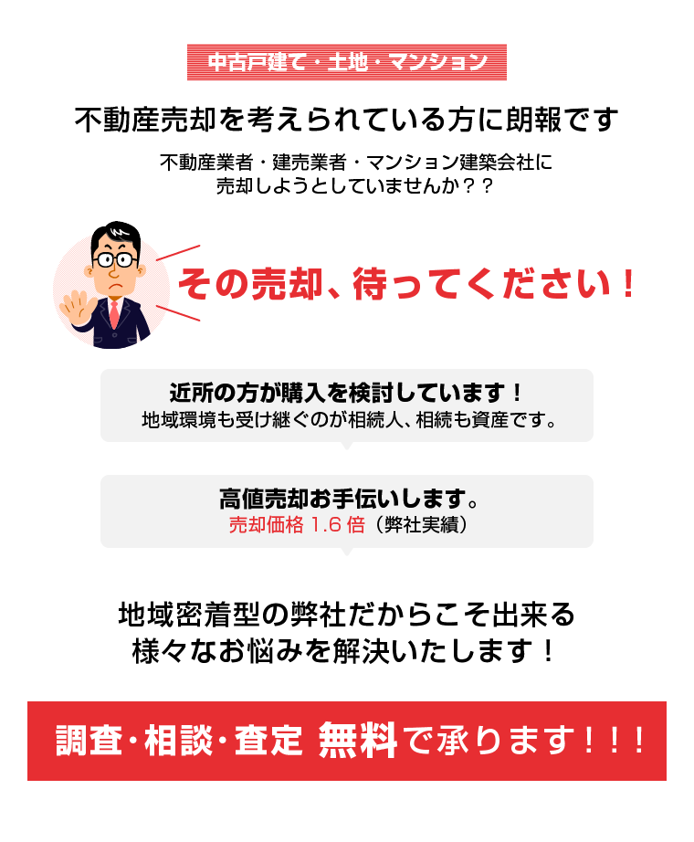 ご売却計画の立て方、売却後の税金、近隣との協会・筆界問題など、不安なことやお困りごとがあれば、なんでもご質問ください。お客様のご希望に合ったご提案をいたします。